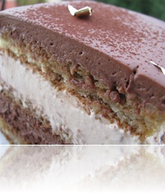 Prendere un vassoio abbastanza grande, rettangolare e piatto. Deporre un foglio in acetato. Sistemarci sopra un quadro in acciaio. Colare uno strato di mousse per lisciare in modo da ottenere uno strato uniforme. Porre in frigo per circa 30 minuti.Rifilare il foglio di biscotto alle stesse dimensioni del quadro, circa 24x24 cm, girarlo in modo da avere verso di noi la parte spugnosa, quella aderente alla carta forno, bagnarlo molto bene con la bagna al caffè e farlo aderire alla mousse per lisciare.Quindi, estrarre dal freezer la mousse al caffè e deporla sul biscotto. Ripetere l’operazione con il secondo foglio di biscotto e con la mousse al cioccolato. Completare con il terzo foglio e bagnare bene sulla superficie . Rivestire tutto il dolce con pellicola ben stretta e porre in freezer.Il giorno dopo, togliere la pellicola, capovolgere il dolce su un piatto rettangolare, togliere il quadro. Riporre in frigo. Al momento, rifilare i bordi. Decorare con un po’ di carta d’oro alimentare. Volendo, si puo’ ulteriormente glassare il dolce con una copertura al cioccolato fondente.