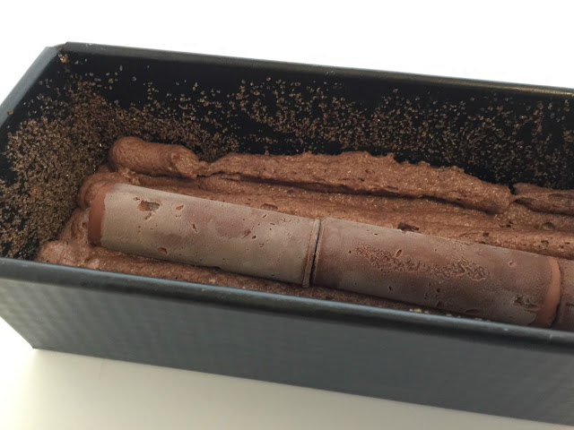 Inserire il biscuit in una sac Ă poche con beccuccio n.10 e distribuire bene il composto fino a ricoprire tutta la barra di silicone. In tutto, circa 180 g di biscuit. Sistemare al centro il cilindro congelato di ganache e ricoprire ancora con il biscuit. Infornare a 160°C per 25 minuti.