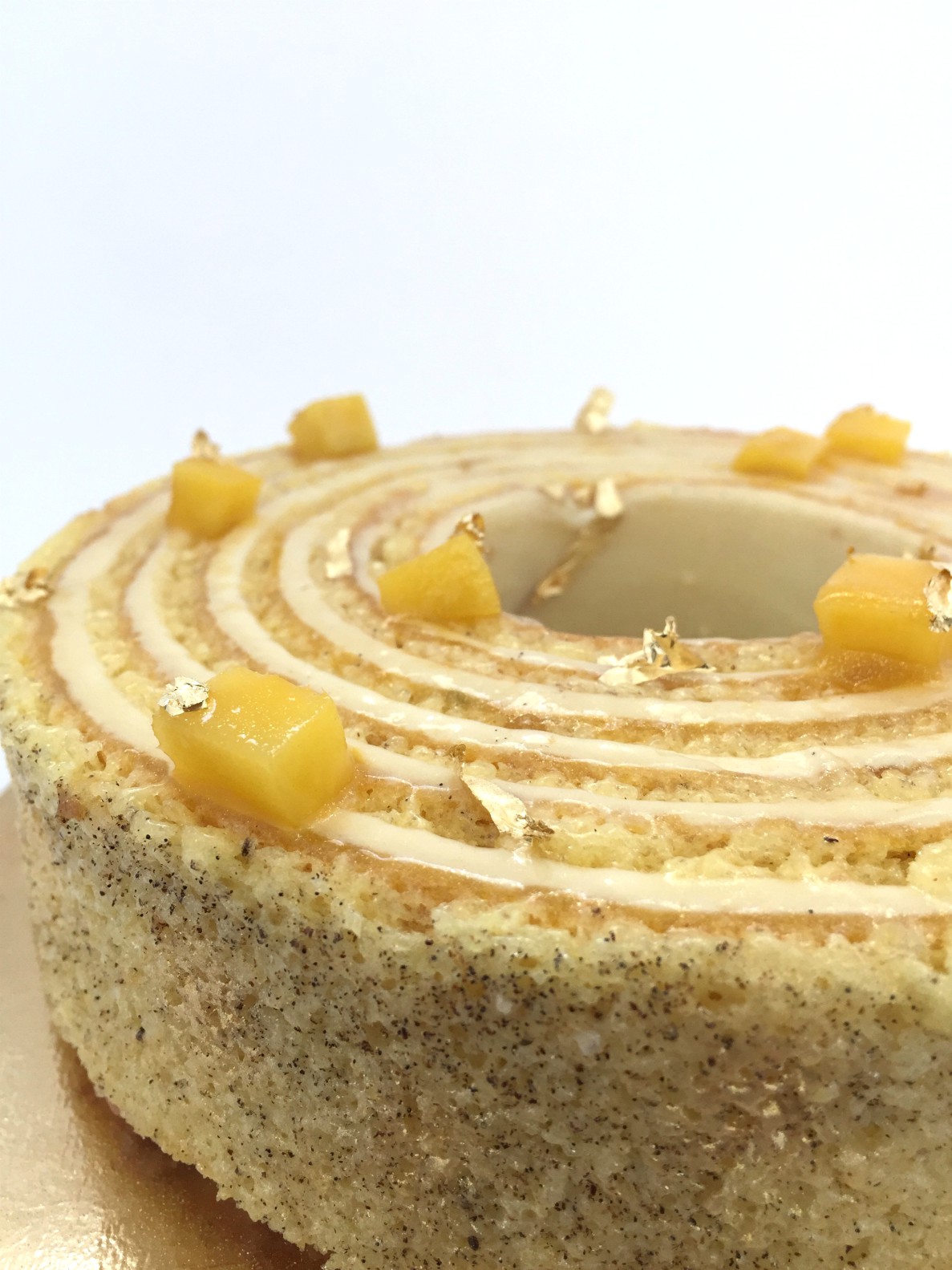 Un vassoio di macarons con la Namelaka e un cuore di mango fresco.