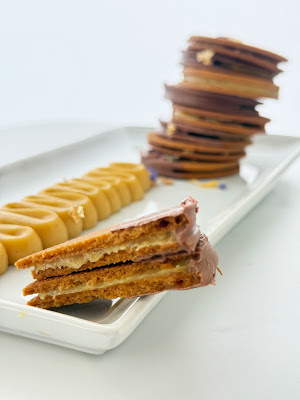In considerazione delle elevate temperature sarebbe stato difficoltoso coppare sull'acetato; per cui, ho immerso la base dei biscotti oppure metà dei frollini nel cioccolato. Ho fatto scolare l'eccedenza e ho poggiato sull'acetato serigrafato. A questo punto, passaggio in frigo a 4 C oppure in abbattitore positivo per far partire la cristallizzazione.